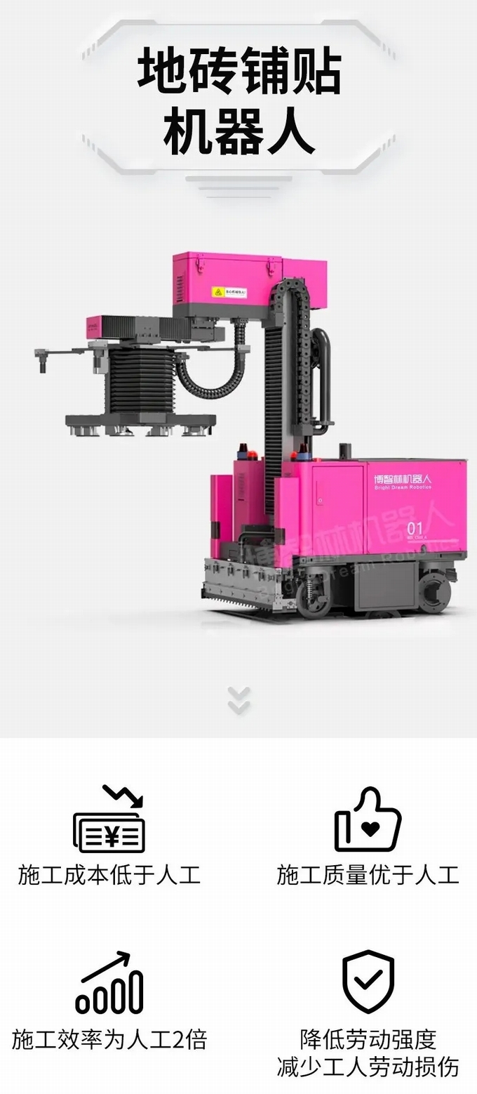 地磚鋪貼機(jī)器人,施工效率是人工的2倍,施工質(zhì)量?jī)?yōu)于人工,且施工成本低于人工。