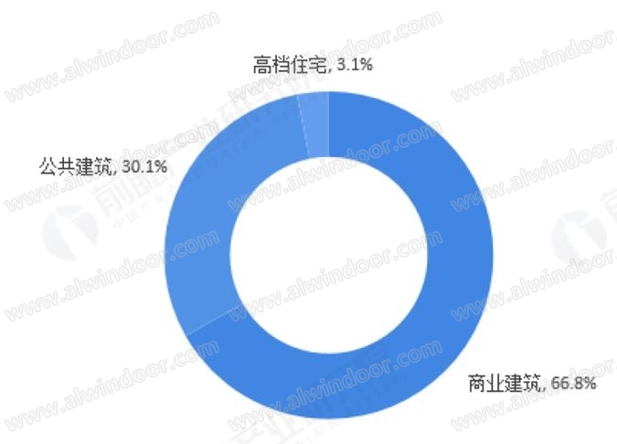 從市場應(yīng)用看,隨著中國城市化進程的快速推進,數(shù)量龐大的大型公共建筑、商業(yè)樓宇及高端住宅不斷涌現(xiàn),是近年來中國建筑幕墻需求快速增長的重要原因。從2013 年的幕墻招標統(tǒng)計信息看,商業(yè)建筑在中國幕墻消費總額中占比最大,約占66.80%;其次是公共建筑,約占30.10%;高檔住宅占比最小,約為3.1%。
