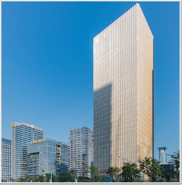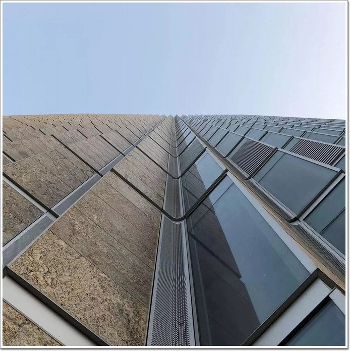 項目亮點:塔樓外立面為鱗次櫛比的鋸齒形幕墻造型,西南視角看為玻璃幕墻,東南視角看為石材幕墻,富有層次感與節奏感。項目包括鋸齒形單元式幕墻、框架式玻璃幕墻、立面錯縫石材幕墻、折線玻璃雨棚、不銹鋼格柵、石材百葉、蜂窩不銹鋼板吊頂、玻璃欄板等。