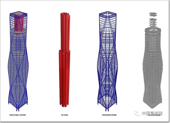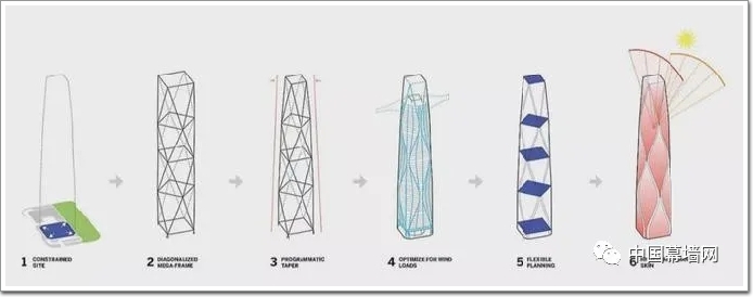 在塔樓的頂部,主角柱向上延伸至頂層桁架,塔冠由拉桿和邊梁組成,通過一系列支桿連接至中心混凝土核心筒,這些結構為機電設備以及隱蔽的建筑維護系統提供了支撐。