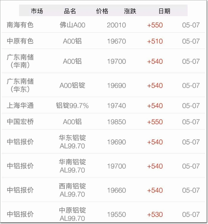 價(jià)格突破20000元大關(guān),“鋁”創(chuàng)新高!2021年5月7日:南海有色鋁含票19960元~20060元,均價(jià)20010元(漲550元);不含票18530元~18630元,均價(jià)18580元(漲550元)。