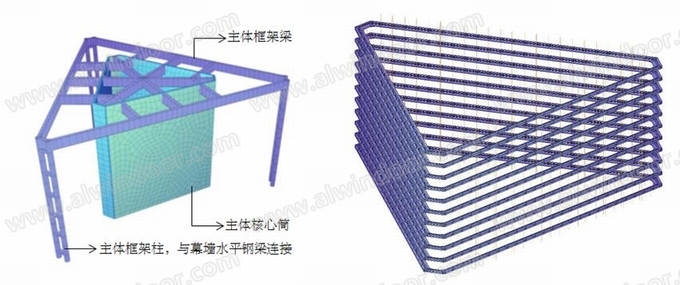 頂部空中大堂的整體結(jié)構(gòu)包括主體框架和幕墻結(jié)構(gòu)。其中幕墻結(jié)構(gòu)由豎向的拉索和水平的鋼結(jié)構(gòu)橫梁(詞條“橫梁”由行業(yè)大百科提供)組成,均需要錨固或支承于主體框架結(jié)構(gòu)上,主體框架需要有足夠的剛度和強(qiáng)度承擔(dān)豎向力和水平力。豎向的拉索上端錨固在頂部的主框架梁,下端錨固在下部樓層的框架梁上;水平鋼結(jié)構(gòu)橫梁則支承在豎向框架轉(zhuǎn)角鋼柱上(圖3)。