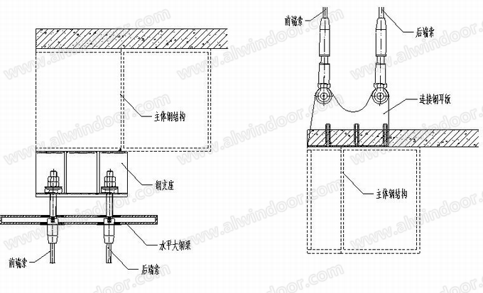 鑒于扁鋼梁長度達(dá)42米,分為三段用塔吊吊裝至38樓層邊緣,采用工裝分層臨時整齊搭設(shè),然后穿設(shè)豎向拉索掛接上下端連接,再分級張拉預(yù)拉力至150KN,最后用設(shè)置在屋頂鋼平臺上5臺卷揚(yáng)機(jī)將鋼板梁同步吊至指定標(biāo)高鎖緊,鋼梁兩端螺栓(詞條“螺栓”由行業(yè)大百科提供)擰緊,裝設(shè)前端吊桿。至此頂部空中大堂幕墻結(jié)構(gòu)系統(tǒng)安裝完成,為安裝單元板塊創(chuàng)造基本條件。需要強(qiáng)調(diào)的是,拉索鎖緊夾具(詞條“夾具”由行業(yè)大百科提供)應(yīng)保持足夠的安全系數(shù),鋼板梁也需要適當(dāng)起拱處理,拉索上下主體大梁也要隨時觀測上下變形。