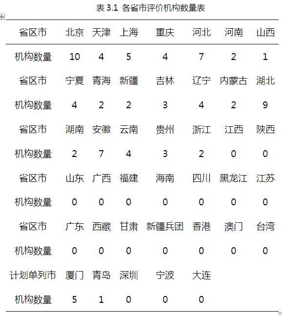 其中已經(jīng)組建并確定一、二星級評價機構(gòu):20個;已組建日常機構(gòu)但未確定一、二星級機構(gòu):6個;僅完成兩部門溝通但未組建管理機構(gòu):7個;未開展工作的為港、澳、臺。全國各地一、二星級評價機構(gòu)總計83家,具體各省市評價機構(gòu)數(shù)量如下表3.1所示[3]。