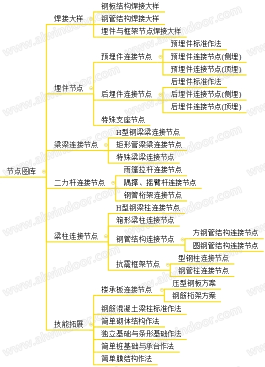 3.3專(zhuān)業(yè)幕墻鋼結(jié)構(gòu)節(jié)點(diǎn)圖庫(kù)是一種可提高設(shè)計(jì)師制圖速度,提高設(shè)計(jì)效率的優(yōu)秀工具。亦可為初入行年輕設(shè)計(jì)師提供一個(gè)快速進(jìn)步,盡早在技術(shù)上成熟起來(lái)的捷徑。所以一個(gè)全面與優(yōu)秀的節(jié)點(diǎn)圖庫(kù)亦是構(gòu)建幕墻鋼結(jié)構(gòu)理論知識(shí)和設(shè)計(jì)技能時(shí)必須子項(xiàng)之一。幕墻鋼結(jié)構(gòu)節(jié)點(diǎn)圖庫(kù)的整體內(nèi)容詳見(jiàn)圖4。圖庫(kù)截至目前為止共收錄386個(gè)常用幕墻鋼結(jié)構(gòu)節(jié)點(diǎn)。涵蓋了鋼結(jié)構(gòu)焊接大樣、預(yù)埋件與后埋件節(jié)點(diǎn)、特殊支座節(jié)點(diǎn)、梁梁連接節(jié)點(diǎn)、梁柱連接節(jié)點(diǎn)、抗震框架節(jié)點(diǎn)、拉桿(詞條“拉桿”由行業(yè)大百科提供)節(jié)點(diǎn)、以及幕墻鋼結(jié)構(gòu)設(shè)計(jì)師知識(shí)技能拓展用的樓承板作法節(jié)點(diǎn)、簡(jiǎn)單砌體結(jié)構(gòu),簡(jiǎn)單獨(dú)立基礎(chǔ)、條形基礎(chǔ)、樁基礎(chǔ)、簡(jiǎn)單混凝土(詞條“混凝土”由行業(yè)大百科提供)框架作法、混凝土結(jié)構(gòu)加固甚至簡(jiǎn)單膜結(jié)構(gòu)(詞條“膜結(jié)構(gòu)”由行業(yè)大百科提供)等。