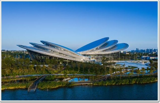 項目亮點:啟東文體中心項目是啟東市的新地標,建筑造型獨特,形如展翅帶飛的蝴蝶,流線造型、形式新穎動感,充滿未來的科技感。采用淺灰色金屬板和鋁合金百葉構成的跌落的三片弧形屋面線條極具動感,為周圍的高層辦公,住宅提供良好的第五立面景觀。整體立面設計采用節能設計,注重自然通風和采光,讓室內外空間交融,建筑與自然對話。在保證建筑外立面(詞條“建筑外立面”由行業大百科提供)結合蝶湖中心獨特濱水地形裝飾效果的同時,體現出啟東特有的文化底蘊。