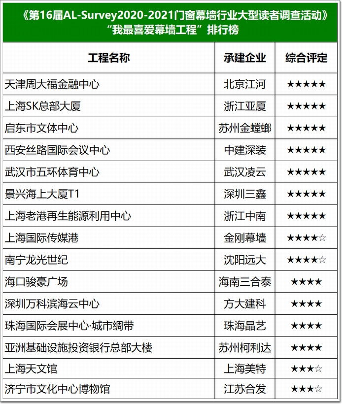 品牌羽化成蝶 2021讓世界發現你丨由中國建筑金屬結構協會主辦,中國幕墻網承辦的“第十六屆AL-Survey 2020-2021門窗幕墻行業年度大型讀者調查暨‘我最喜愛幕墻工程’”榜單由此產生。