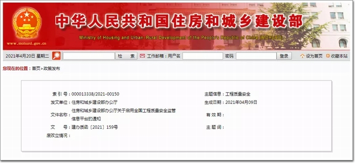 (四)公共服務門戶。發布房屋建筑和市政基礎設施工程質量安全監管領域相關通知公告、行業動態、地方信息、全國工程勘察設計大師、工程質量安全專家委員會、城市軌道交通專家委員會信息以及工程質量安全事故情況,提供工程質量安全監管數據和政策法規查詢等服務。