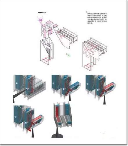 通過對歐洲系統的研究發現,系統門窗的組角連接采用的是專用的鑄鋁角碼配以空心不銹鋼銷釘(詞條“銷釘”由行業大百科提供)+注膠。這種組角工藝包含了兩項特殊技術:一是膨脹拉緊固定技術,二是注膠密封技術。每個鑄鋁角碼是由兩瓣鑄鋁件構成的,當不銹鋼空心銷釘打入后,兩瓣鑄鋁件會自動脹開,加上角碼銷釘孔和型材銷釘孔的配合公差,將兩根45 度拼接的型材牢牢拉緊、固定。固定完成后,接下來要通過銷釘的注膠孔向角碼內注膠。維透視圖中紅色部分顯示的就是組角膠在角碼內流動的路徑。注膠完成后型材45度拼接處,從腔體內部完全用膠密封住了。角碼與型材腔體之間的縫隙也完全封死了。
