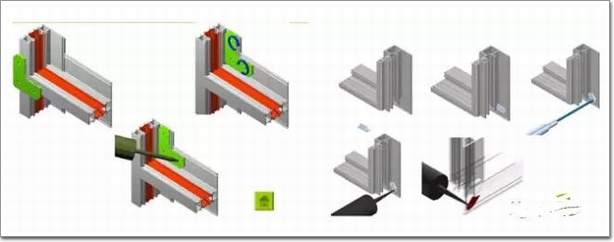 普通鋁合金門窗對這個部位一般不處理,或者只是象征性的在拼接處抹點玻璃密封膠,可以說基本上沒有起到密封的作用。系統門窗在這個部位采取了特殊的措施,安裝了一個帶凹槽的不銹鋼或鋁合金卡件,一方面補強了薄壁處的連接,避免拼接處開縫;另一方面,通過在不銹鋼卡件和型材之間注膠,完全保證了拼接處的密封。