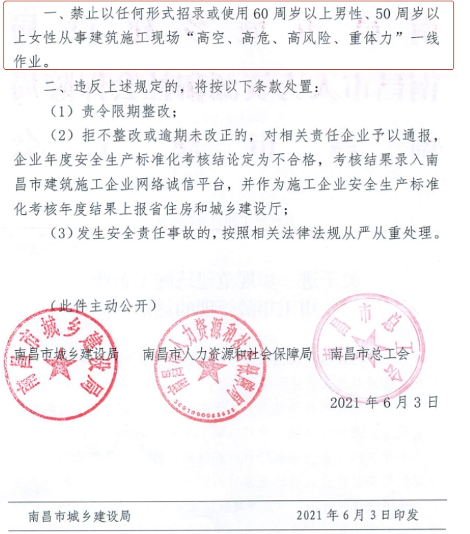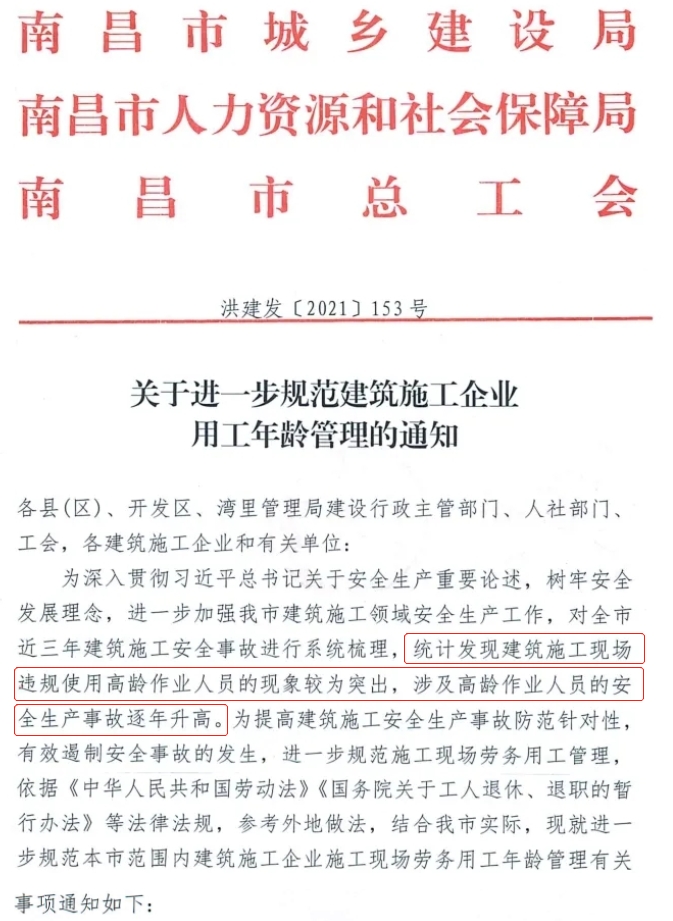 6月11日,南昌市城鄉建設局發布了關于進一步規范建筑施工企業用工年齡管理的通知,通知明確: