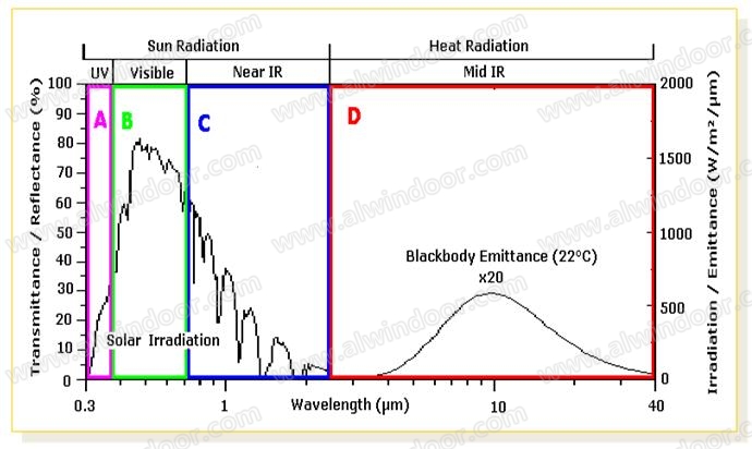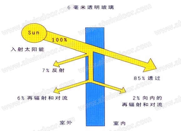 圖中顯示,85%的透射比稱為太陽光的一次透射比或直接透射比,這85%透過的是太陽光。2%的透射比稱為二次透射比或再次透射比,這2%透過的就不是太陽光了,雖然它源于太陽光,但它是玻璃吸收部分太陽光,使得自身溫度升高,向室內發射的熱輻射,即這2%透過的是遠紅外線。太陽光一次透射比加上二次透射比稱為太陽光總透射比。