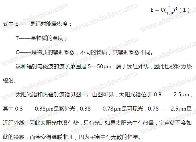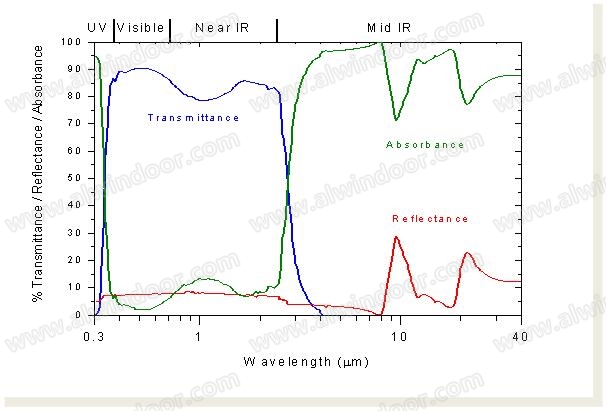 圖二是浮法玻璃的光譜圖。由圖二可見,浮法玻璃對于太陽光幾乎是完全透明的,而對于熱輻射則是完全不透明的,這也是玻璃能夠作為維護材料使用的根本原因。試想,如果玻璃對于熱輻射是透明的,那么對于熱量即沒有室內外之分,熱量在室內外之間傳遞沒有任何阻力,玻璃也就不能作為維護材料使用了。