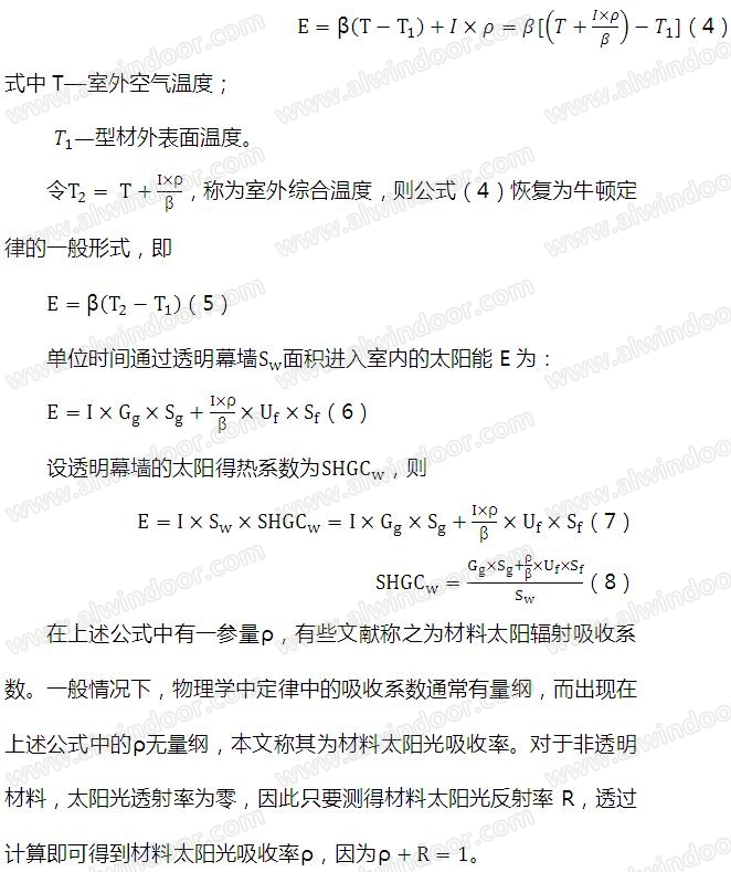透明幕墻一定是玻璃幕墻,但透明幕墻除玻璃外,還有型材等非透明部分。設太陽輻射照度為 ,幕墻玻璃的太陽光總透射比即太陽得熱系數為G,幕墻玻璃面積為 ,幕墻型材太陽輻射吸收率為 ,型材的傳熱系數為 ,型材的面積為 ,幕墻外表面換熱系數為 。根據牛頓定律,由室外傳入室內的熱量為: