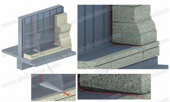 本項目砌筑石材采用了雙道防水設計,外側砌筑石材內部設置了1mm厚海防級不銹鋼板,不銹鋼板搭接部位做好防水膠處理。砌筑石材底部設置披水板和排水孔,將進入石材內部的水排出。