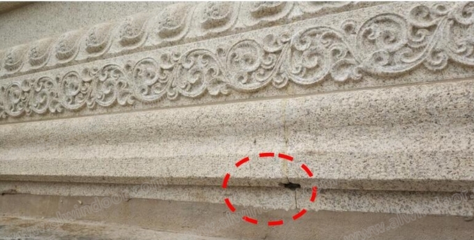 環廊部位柱腳石材單塊重量達到了1.5噸,石材之間通過砌筑進行連接,石材之間縫隙很小,近乎無縫,保證了復雜佛教花紋的連續。