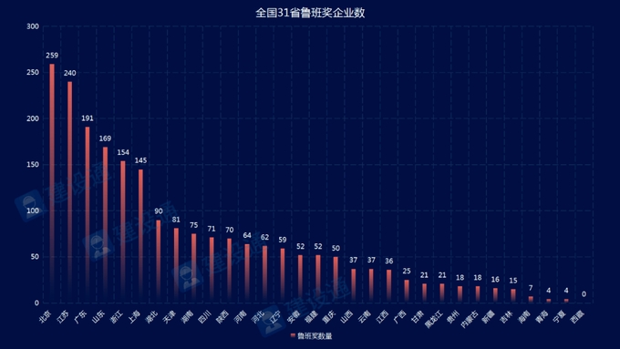 在全國31省中,北京市獲得魯班獎(jiǎng)企業(yè)數(shù)為259家,位居第一;江蘇省獲得魯班獎(jiǎng)企業(yè)數(shù)為240家,位居第二;廣東省獲得魯班獎(jiǎng)企業(yè)數(shù)為191家,位居第三。
