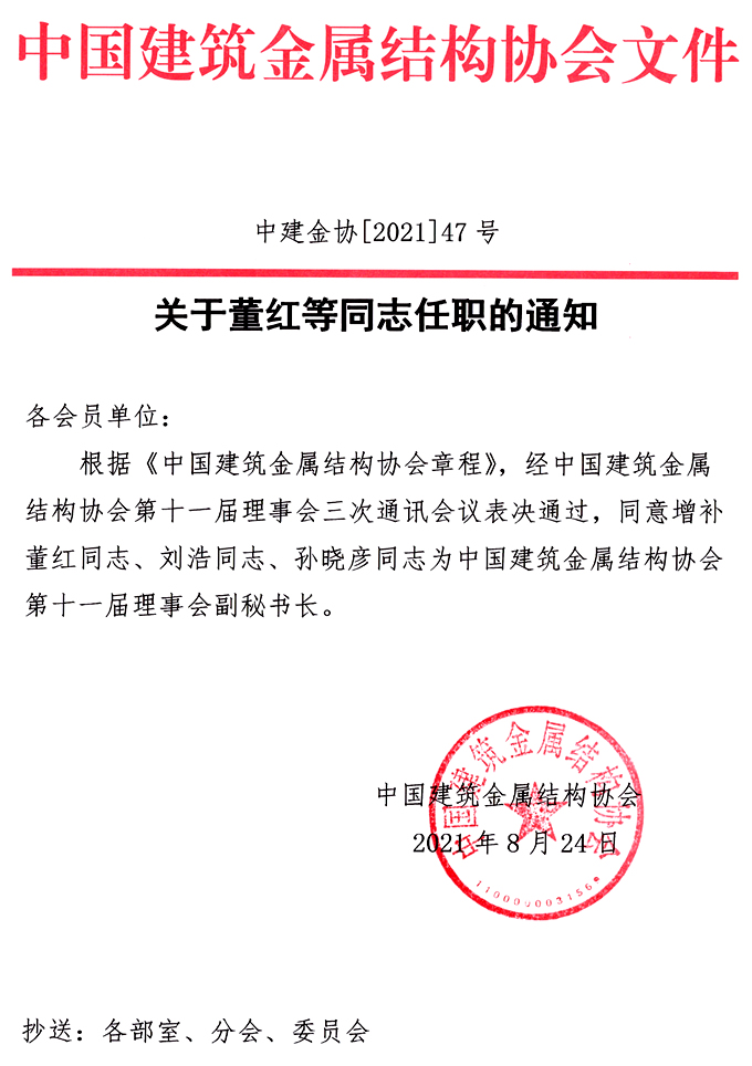 根據《中國建筑金屬結構協會章程》,經中國建筑金屬結構協會第十一屆理事會三次通訊會議表決通過,同意增補董紅同志、劉浩同志、孫曉彥同志為中國建筑金屬結構協會第十一屆理事會副秘書長。