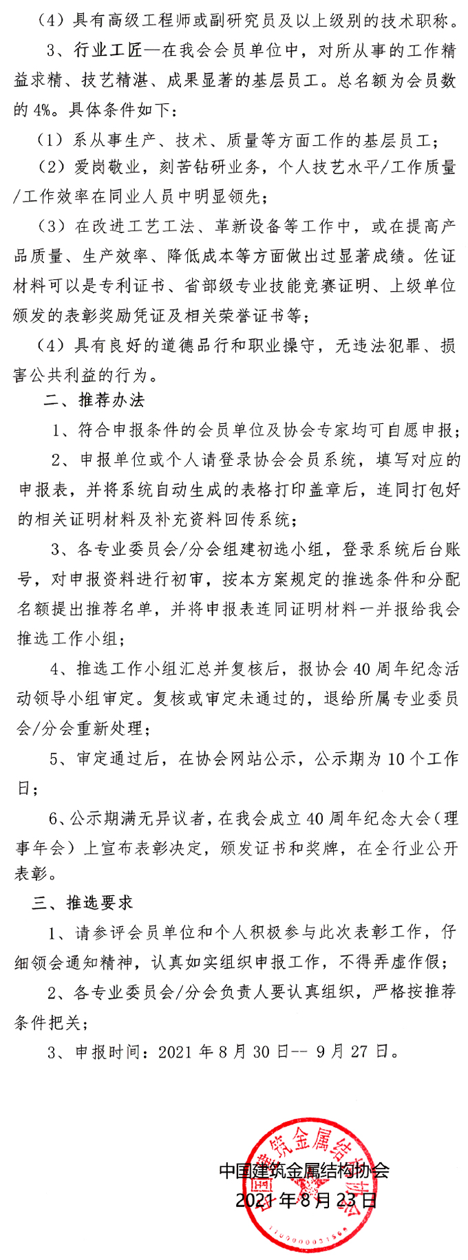 關于開展中國建筑金屬結構協會行業先進單位和優秀個人表彰活動的通知