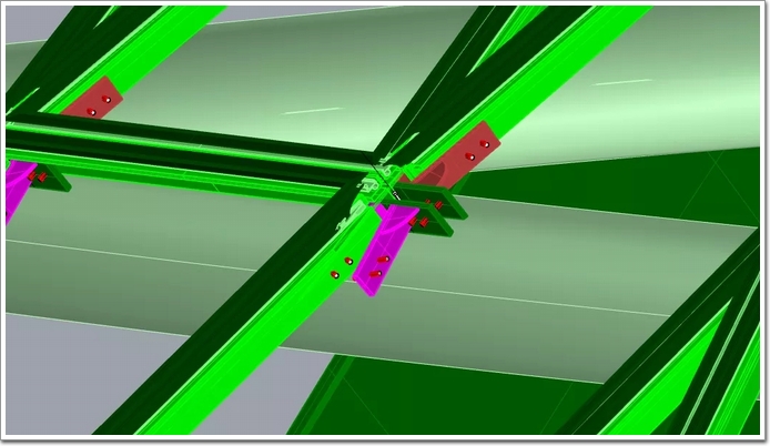 現(xiàn)場施工方面,采用全站儀等設(shè)備對結(jié)構(gòu)鋼梁進行復(fù)核檢測,考察施工材料的變形特性。施工過程中,項目團隊提前布控幕墻安裝點,結(jié)合數(shù)據(jù)指導(dǎo)和成熟的施工經(jīng)驗,有效地保證了材料在安裝前就能達到消化結(jié)構(gòu)誤差的目的。設(shè)計人員根據(jù)返尺數(shù)據(jù),提前計算出每個鋼件、龍骨的進出位置及角度,為指導(dǎo)現(xiàn)場安裝、保障安裝進度提供有力支持。