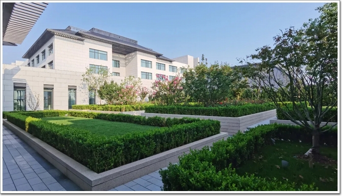 濃厚古典中式風格的攬月庭由金屬屋面、鋁板和金屬格柵線條系統(tǒng)打造,在此可極目遠望園林景觀。