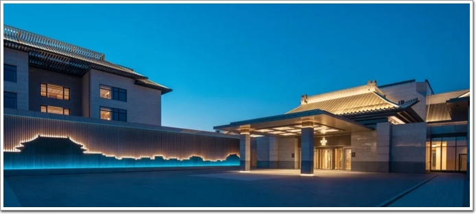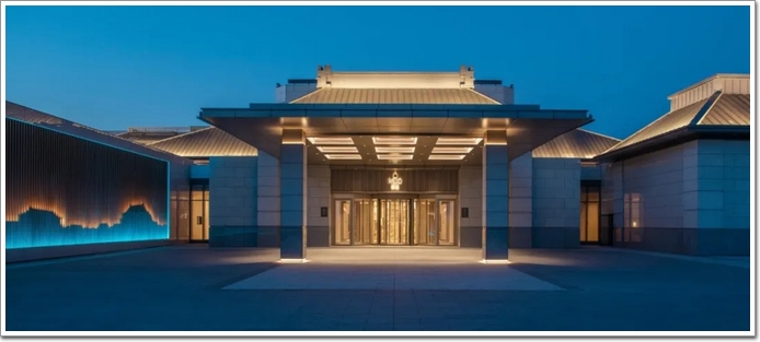 雨棚及主出入口形成強烈的現(xiàn)代建筑色彩,將整個酒店中式﹑奢華﹑典雅的建筑風格展現(xiàn)得淋漓盡致。