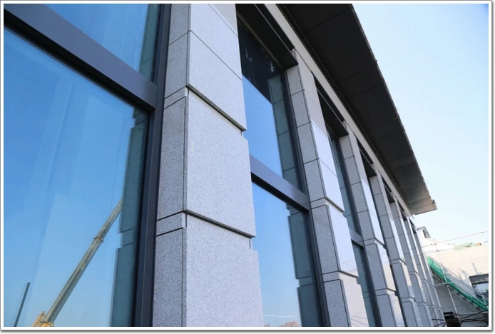 為更好地滿足酒店外立面的高要求,項目團隊精選優(yōu)質(zhì)石料,嚴格對板塊進行定厚切割、磨邊倒角,并采用浸泡式六面防護措施,材料安裝完成后,型材(詞條“型材”由行業(yè)大百科提供)立柱、室內(nèi)外玻璃全部采用覆膜的成品保護措施,有效規(guī)避了型材玻璃劃傷、燙傷的可能性。
