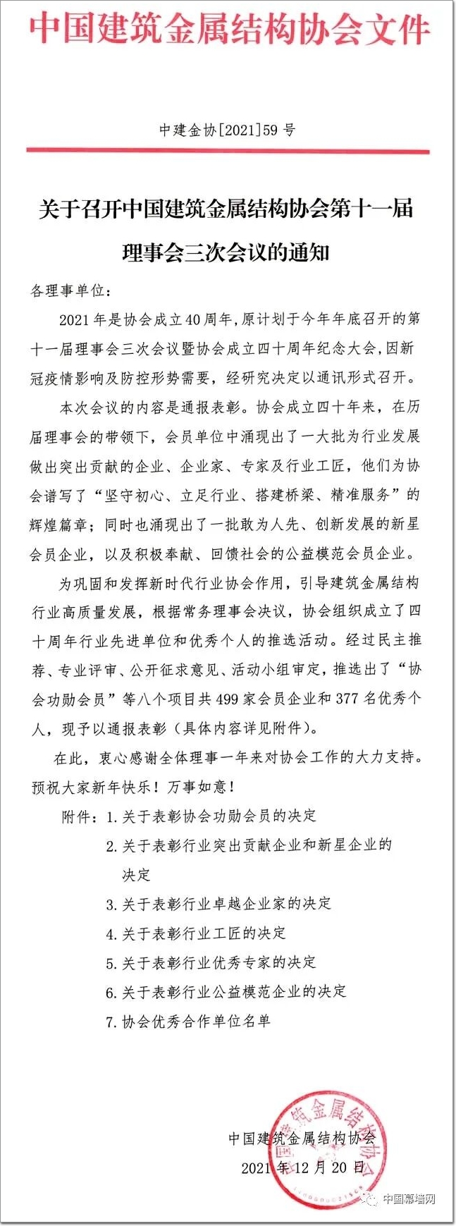 2021中國建筑金屬結(jié)構(gòu)協(xié)會(huì)第十一屆理事會(huì)三次會(huì)議暨協(xié)會(huì)成立四十周年紀(jì)念大會(huì),表彰了一批為行業(yè)高質(zhì)量發(fā)展做出杰出貢獻(xiàn)的優(yōu)秀企業(yè),它們是建筑行業(yè)改革開放以來標(biāo)桿企業(yè)與杰出代表,為整個(gè)行業(yè)繁榮發(fā)展、賦能創(chuàng)新助力添彩。