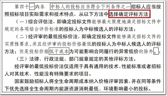 (二)經評審的最低投標價法,即投標文件能夠滿足招標文件的實質性要求,并且經評審的投標價格最低的投標人為中標人候選人的評標辦法;但是投標價格低于成本可能影響合同履行的異常低價的除外。