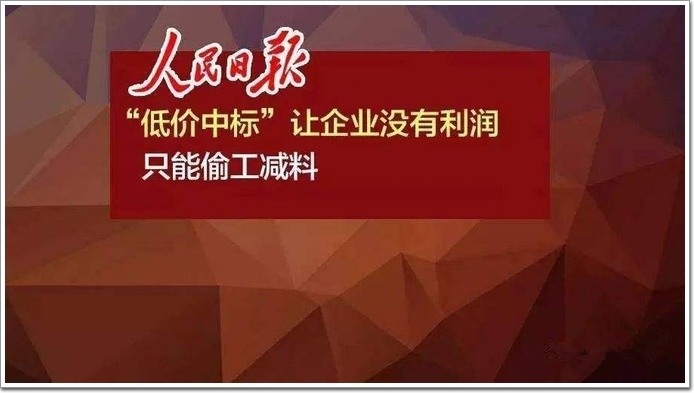 《人民日報》曾兩次發文詬病“最低價中標”,實為罕見!建設工程質量因“最低價中標”問題頻發,使得整個行業怨聲載道,也在給業內人士敲響警鐘:“一些地方的招投標制度可謂‘簡單粗暴’。只要‘最低價中標’原則不變,就很難有什么工匠精神、百年老店!”