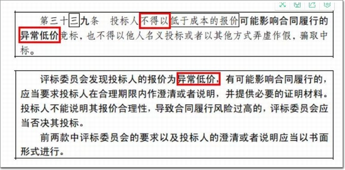 盡管法律文件等對招投標的各項指標都做出了規定,但技術等指標的優劣很難在使用前評判,只有價格最易分出高下。為了最大程度節約資金,提高效率,一些工程在招標中故意忽視“能夠滿足招標文件的實質性要求”這個條件,將低價作為最高標準。即使發現投標人報價過低,也不啟動價格認定程序,導致投標人不計成本地惡性競爭。
