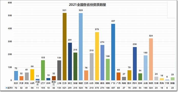 從表格數據分析,除西藏、臺灣、香港、澳外,國內30個省份均擁有建筑幕墻工程專業承包一級資質的企業。其中,江蘇以521家位列首位,福建以520家位居第二,廣東、河南、陜西分別以437家、373家、324家排名其后。