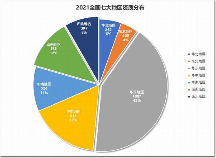從全國七大片區企業數量占比來看,華東七個省份(上海、江蘇、山東、浙江、福建、安徽、江西)共有1987家企業擁有建筑幕墻工程專業承包一級資質,約占該資質擁有企業全國總數的42%,為全國最多;