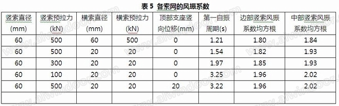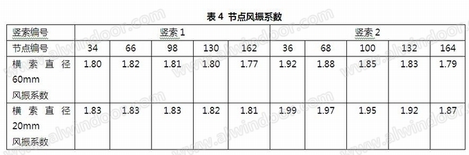 橫索直徑改為60mm,預拉力500kN,豎索還是直接60mm,預拉力500kN,計算風振系數如表4所示。由計算結果可知,橫索加大直徑和預應力(詞條“預應力”由行業大百科提供),使得整個索網的剛度有所提高,風振系數比原來橫索直徑為20mm時的數值較小。