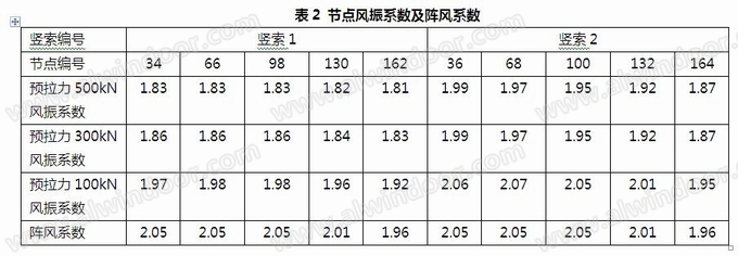 以上分析僅考慮了豎向拉索的預拉力為500kN的情況,當豎索的預拉力分別為300kN,100kN的風振系數詳見表2。由計算結果可知,隨著預拉力的減小,索網剛度變弱,其風振系數逐漸變大。