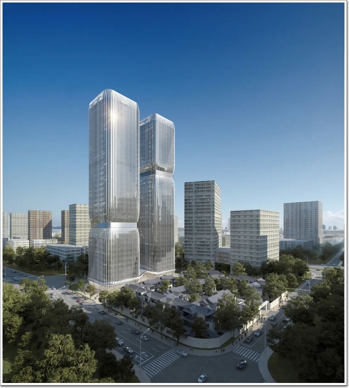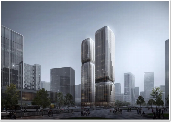 杭州望廷中心項目位于杭州錢江世紀城的核心區域,包含辦公、商業等功能。設計從西湖荷香中汲取靈感,通過建筑結構在“避難層”位置錯落收分,配合幕墻外立面的凹凸變形,打造出“藕節般”獨特的建筑輪廓。同時,以中心對稱的雙塔,打破呆板的視覺體驗,寓意“佳偶天合”。