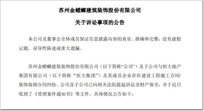 2021年12月3日,金螳螂公告稱,本次起訴恒大涉及案件共694件,案由均為恒大及其成員企業未按合同約定如期支付工程款等款項,案涉標的額共8.82億元。