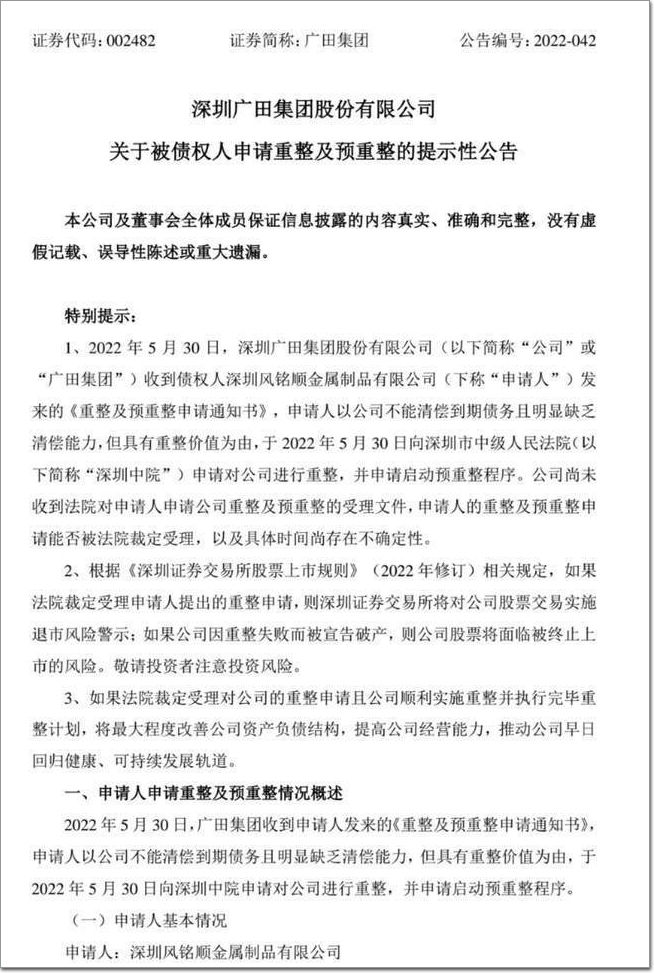 被中國恒大所累,今年5月31日,廣田集團發布公告稱,公司受第一大客戶恒大集團影響,有3.92億元銀行債務出現逾期,因為債務違約,公司債權人申請對公司進行重整。