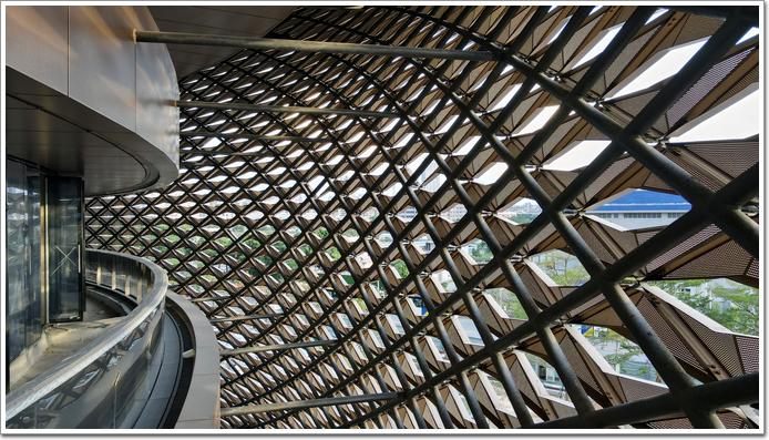 曲面+穿孔,兩項技術一個中心︱整個項目的重點、難點和最大亮點是特征鋼網架穿孔鋁板系統,其主要由超高精級自由曲面特征鋼網架,配上兩端可調節十字連接件(詞條“連接件”由行業大百科提供)和穿孔特征鋁板組成。
