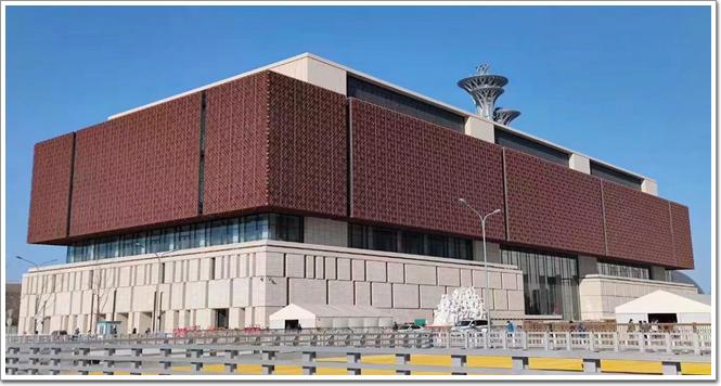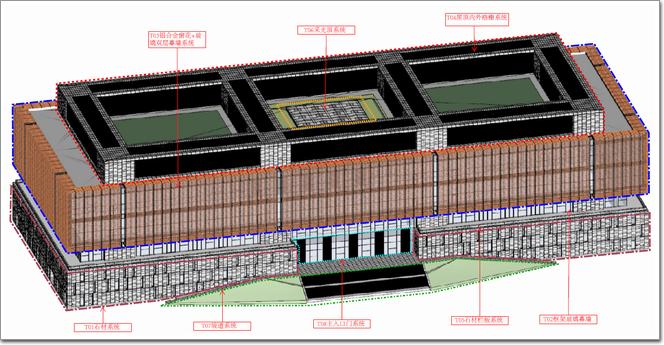 以及T04系統(tǒng):屋頂仿石材鋁板、仿石鋁格柵、鏤空窗花及背襯鋁板系統(tǒng);T05系統(tǒng):“仿窗花”穿孔鋁板及石材欄桿系統(tǒng);T06系統(tǒng):屋面直立鎖邊及采光頂拉網(wǎng)板系統(tǒng);T07系統(tǒng):室外人行、汽車坡道幕墻系統(tǒng);T08系統(tǒng):室外門系統(tǒng)(含主入口窗花紋理銅制門)等八大子系統(tǒng)組成。