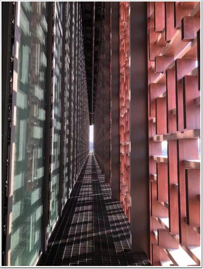 中國工藝美術(shù)館外立面幕墻中,需要用一套支撐結(jié)構(gòu),來支撐起兩套幕墻體系,此項(xiàng)工藝雖不罕見,但項(xiàng)目內(nèi)層的玻璃幕墻和外層的金屬格柵之間,足足有1.5米的間距。