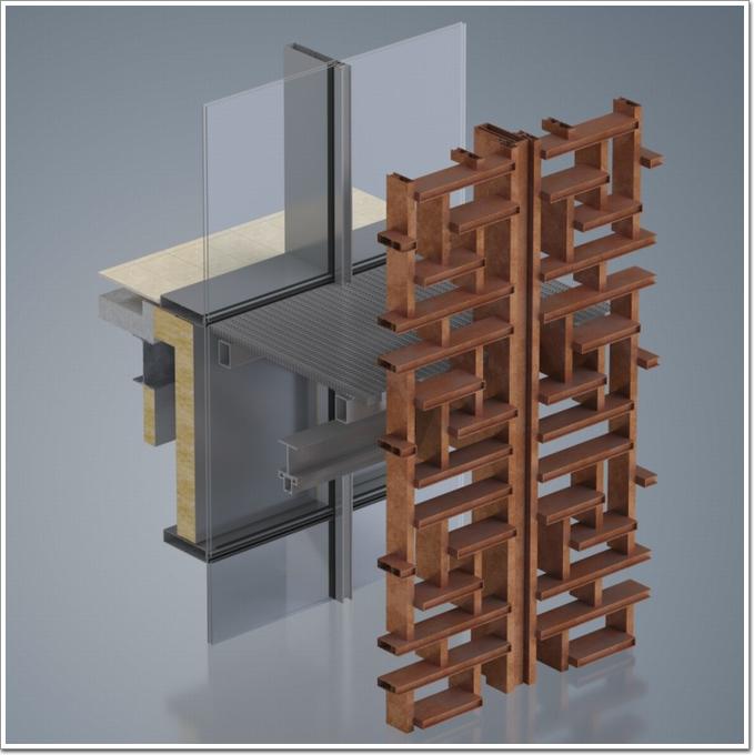 12800塊石材、2674塊玻璃、1450塊金屬格柵,共同組成了完整的外立面幕墻體系。在武漢凌云承擔(dān)的“中國工藝美術(shù)館”項(xiàng)目中,幕墻面積達(dá)到6.7萬平米,造價(jià)超過1.1個(gè)億。其中包含T01系統(tǒng):新型開縫石材與鋁合金窗相間幕墻系統(tǒng);T02系統(tǒng):大跨度、大分格、豎明橫隱玻璃幕墻;T03系統(tǒng):裝配式仿木紋鋁窗花及內(nèi)襯玻璃“雙層”幕墻系統(tǒng)。