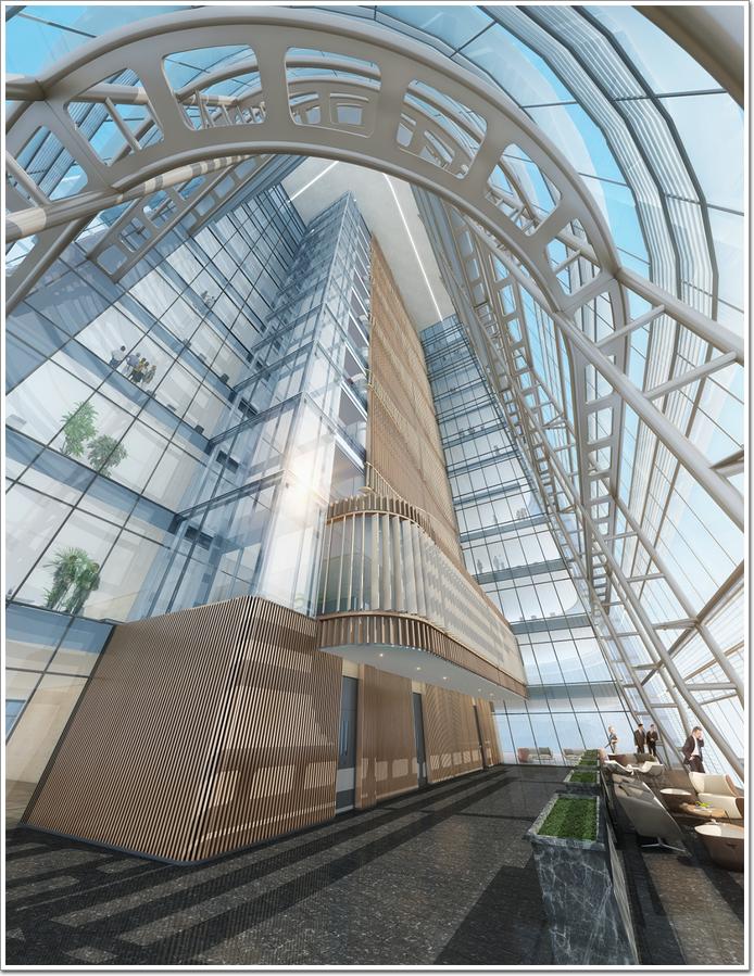 項(xiàng)目占地面積近2.2萬(wàn)平方米,總建筑面積約35萬(wàn)平方米,幕墻的設(shè)計(jì)與施工過(guò)程中,三鑫打造的幕墻體系包括:塔樓外幕墻、天幕、頂冠、首層大堂、52-70層中庭內(nèi)的電梯包覆、內(nèi)幕墻、中部天幕玻璃地板和玻璃欄板等,幕墻及外立面裝飾工程總面積約85,000平米。