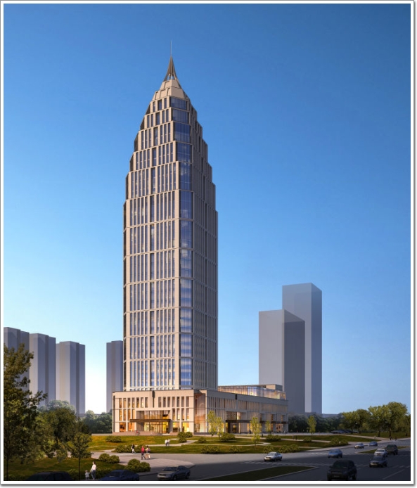 棗莊金融大廈項目位于棗莊市薛城區新城街道核心區,總建筑面積約7.6萬平方米,總建筑高度169米。其中,地下2層,地上塔樓33層,裙樓3至5層。項目建成后將作為星級酒店及5A級金融辦公和寫字辦公用樓,也將成為光明大道沿線最高的標志性建筑