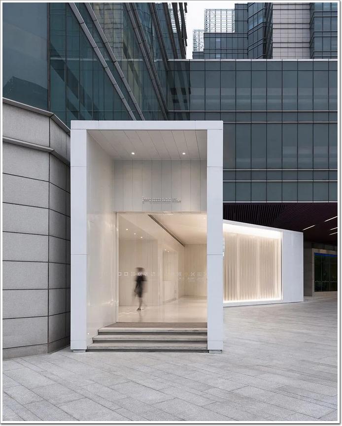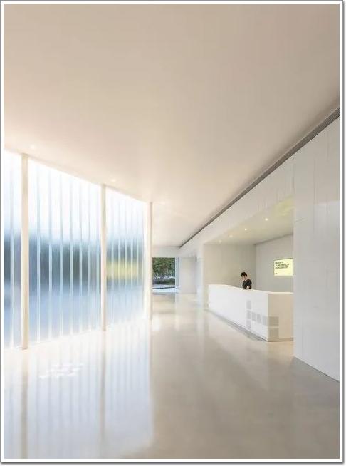 位于上海浦東新區張江高科園區的昊美術館,門廳外立面材料以超白U型半透玻璃與白色琺瑯鋼板相結合。