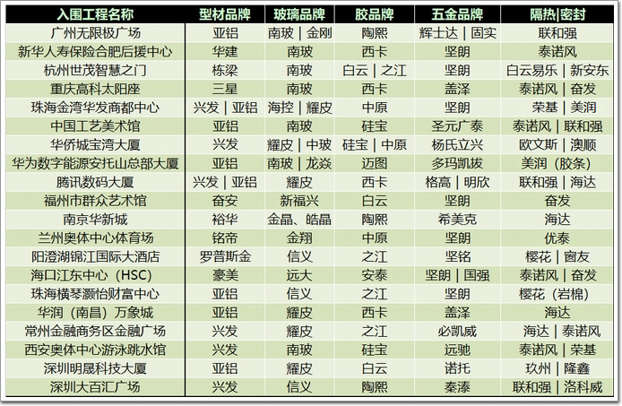 通過上面這張工程中材料選用情況的信息表,我們可以發現本年度入圍的幕墻工程項目,所選用的鋁型材、玻璃、五金、建筑膠、隔熱條和密封膠條等,均為歷年3月廣州年會上發布的——中國門窗幕墻行業“首選品牌”上榜企業。