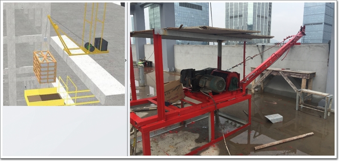 疫情反復(fù),導(dǎo)致項目的工期緊張,為了補償軌道吊的運力不足,在屋面層以下,在不拆除原有窗檻墻的情況下,只拆除開啟扇。廣晟的施工團隊利用開啟扇洞口,單獨架設(shè)雞公吊(炮機)等相關(guān)起重設(shè)備(詞條“設(shè)備”由行業(yè)大百科提供),作為面板材料的輔助吊裝、安裝措施。