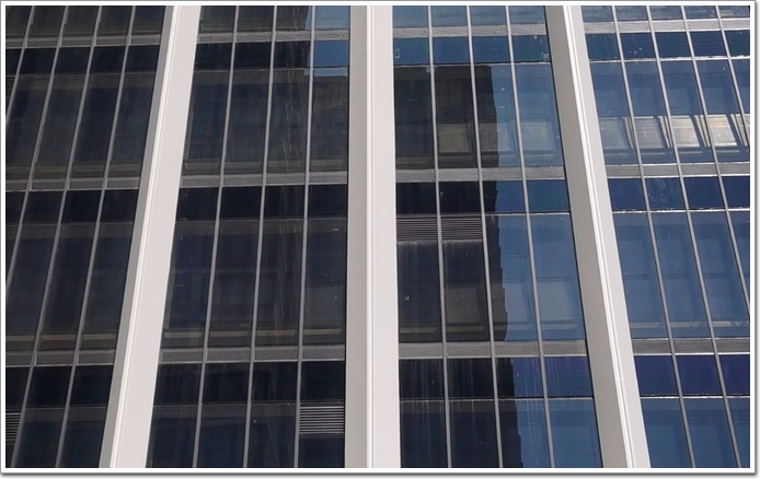在外立面的優(yōu)化過程中,廣晟團隊采取了轉(zhuǎn)角斜面化處理,使得整體體態(tài)更加優(yōu)雅,與周邊環(huán)境的界面更柔和,虛實有致,層次清晰。同時,還考慮雙層幕墻的設(shè)計,外幕墻框架與室內(nèi)裝飾線條雙色處理。其中,在室內(nèi)及與鋁合金窗之間的封包鋁板,全部采用白色,弱化外幕墻骨架帶來的視覺沖擊;而在室外搭配光伏幕墻(詞條“光伏幕墻”由行業(yè)大百科提供)玻璃,又都采用了深色系,形成統(tǒng)一色調(diào)。