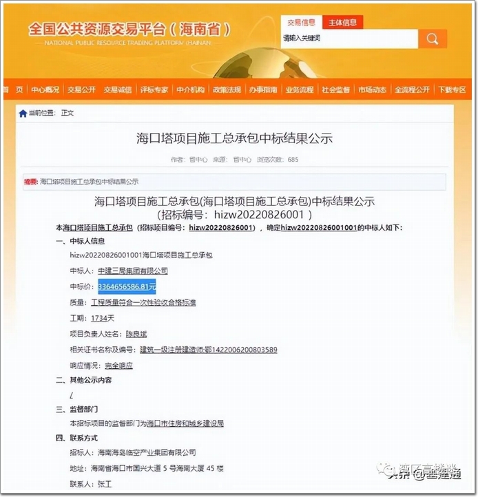 近日,中國幕墻網(wǎng)ALwindoor.com發(fā)現(xiàn)在全國公共資源交易平臺(tái)上,公示了海口塔項(xiàng)目施工總承包中標(biāo)結(jié)果,停工三年多的海口塔總承包招標(biāo)結(jié)果公布:中建三局以33.65億中標(biāo),較招標(biāo)控制價(jià)(最高限價(jià))低了約3.01億元,計(jì)劃工期為1734天。