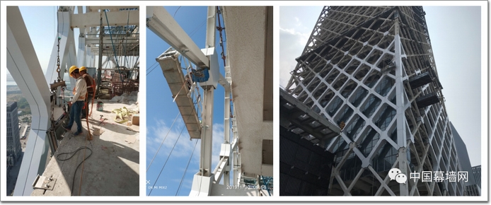 深圳信通金融大廈的斜交網格——類似于外骨骼——將結構拉到外部,并有效地將塔懸掛在內部,以創建無柱的工作空間。基于如此創造性的設計,項目的菱形斜交鋼網格與結構樓板邊緣的間距僅1米,施工空間狹小,在玻璃幕墻安裝時大型吊裝設備無運行空間,鋁板幕墻(詞條“鋁板幕墻”由行業大百科提供)安裝時高空作業無施工平臺,施工難度大。